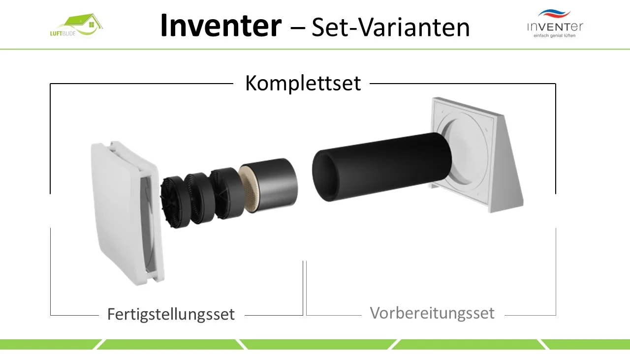 Das Fertigstellungsset wird benötigt, wenn das Vorhergegangene Vorbereitungsset bestellt wurde und die Wandeinbauhülse, inklusive Außenhaube bereits montiert sind. So bekommt man in diesem Set alle Restlichen Bestandteile des Lüftungsgerätes:
