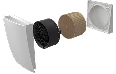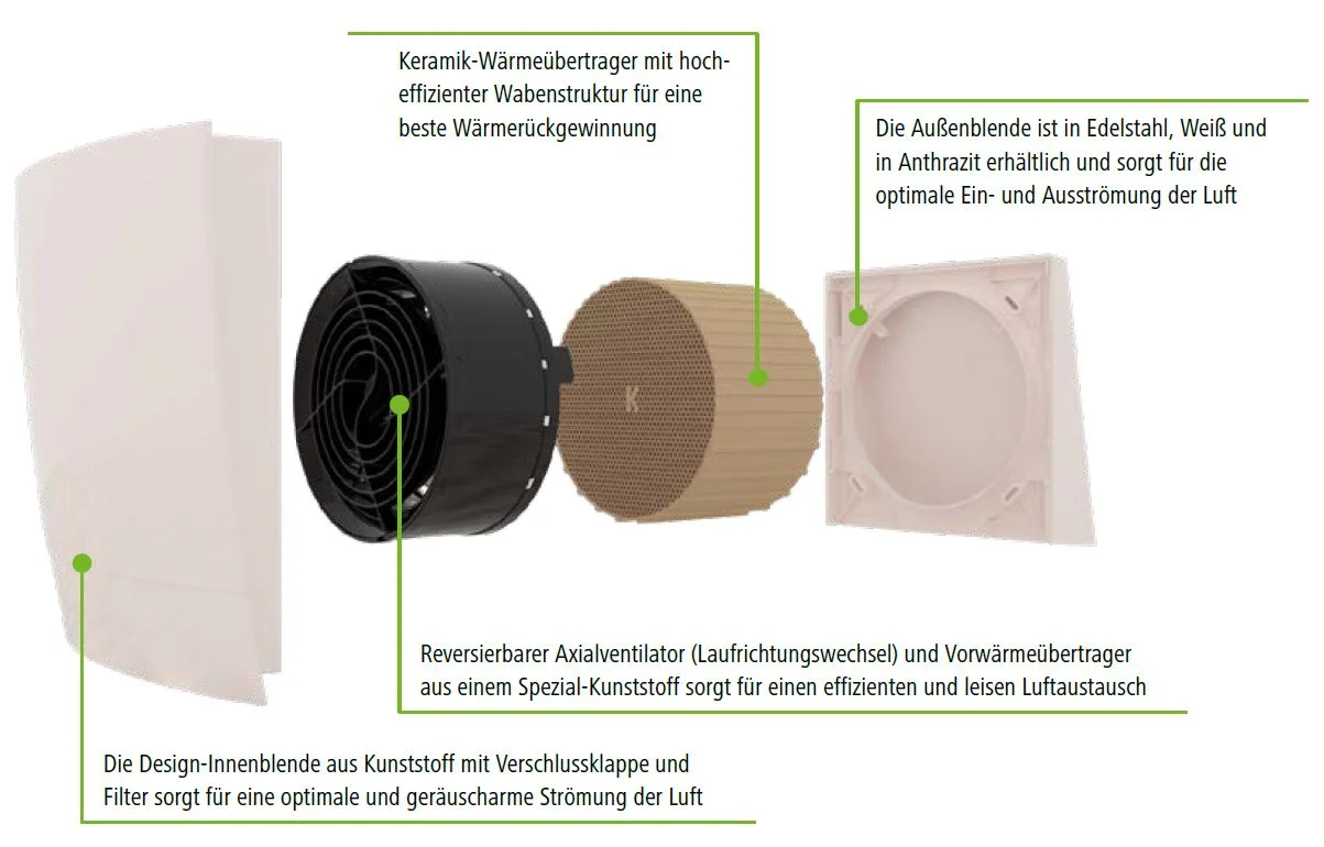 Die Kunststoff Design-Innenblende mit Verschlussklappe mit integriertem Filter sorgt für eine gute und geräuscharme Luftströmung. Der leise und effiziente Luftaustausch wird durch den reversierbaren Axialventilator erreicht. Der Wärmetauscher aus Keramik sorgt für eine Wärmerückgewinnung von maximal 88,8%.