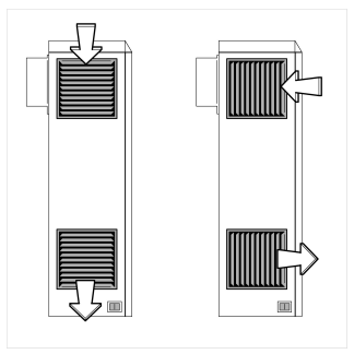 Sollte das Raumlüftungsgerät Air Mini an Orten installiert sein, an denen der Mindestabstand zu angeströmten Objekten nicht eingehalten werden kann, können Sie entsprechend das Abluft- und Zuluftgitter nach vorne drehen (siehe Abbildung). Entfernen Sie dazu die Frontverkleidung, lösen Sie die Gitter aus ihren Arretierungen und setzen Sie sie um 90° gedreht wieder ein.