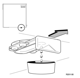 Ebenso müssen Sie regelmäßig den Kondensatbehälter leeren. Ziehen Sie dazu den Schieber nach vorn und lassen Sie das Kondensat in einen bereitgestellten Behälter laufen. Danach bewegen Sie den Schieber wieder in die Ausgangsposition.