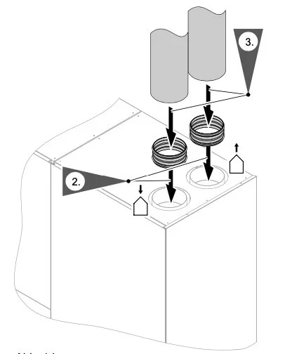 Um die Gerätemodule zu verbinden, wird ein Gewindebolzen in das vordere Gewinde am Zu- und Abluftmodul eingeschraubt. Beide Module werden nun mit den Stellfüßen ausgerichtet und mit Muttern angezogen (6,7), um einen Spalt für die Geräteverbindung zu schaffen. Die Rohrverbindungsstücke des Lüftungsmoduls werden bündig an die Rohrenden des Zu- und Abluftmoduls geschoben (8) und mit einem Spannring gesichert (9).