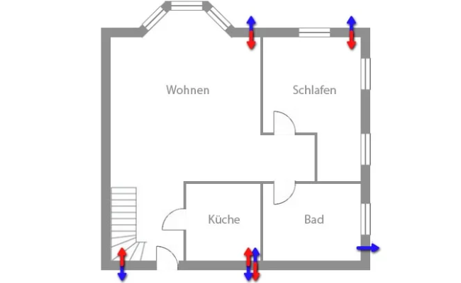 Laut der Norm DIN 1946-6 müssen im Lüftungskonzept die vier sogenannten „Lüftungsstufen“ berücksichtigt werden. Diese Stufen stellen verschiedene Nutzungsbedingungen und -situationen in einer Wohneinheit dar, für die ein Lüftungskonzept nach DIN 1946-6 einen ausreichenden Luftwechsel sicherstellen muss. Wichtigste Stufe ist der Mindestluftwechsel zur ausreichenden Belüftung zum Feuchteschutz. Diese zentrale Anforderung an das Lüftungskonzept muss stets sichergestellt sein. Stellt das Lüftungskonzept lüftungstechnisch notwendige Maßnahmen fest, können Sie sich anschließend für konkrete Maßnahmen entscheiden.